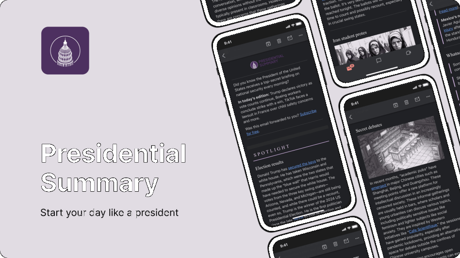Presidential Summary is a daily newsletter delivering concise, unbiased briefings on global affairs, markets, science, culture, and more. Modeled after the top-secret intelligence briefings world leaders receive, it filters out the noise and delivers only the most essential updates each morning. With sharp reporting and clear language, it helps readers start their day fully informed and ahead of the conversation, without spin, fluff, or wasted time.